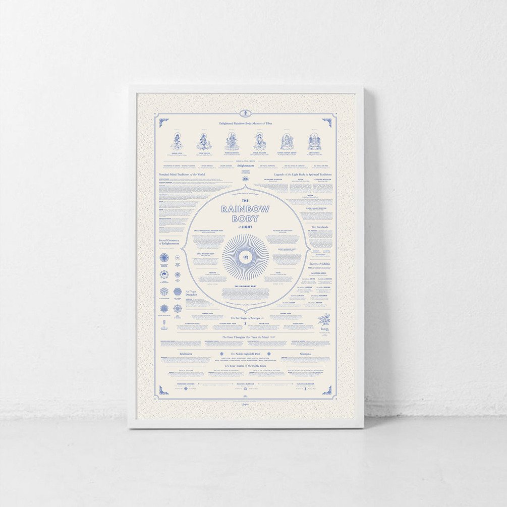 The Rainbow Body Map Poster is a profound work of art, meticulously designed to awaken and inspire all those who seek the mystical path of spiritual awakening and enlightenment. Legends speak of yogis meditating deep in the caves of the Himalayas, developing supernatural powers and transcending the physical realm by transforming their bodies into pure rainbow light, escaping samsara and directing their consciousness to the Purelands and beyond.